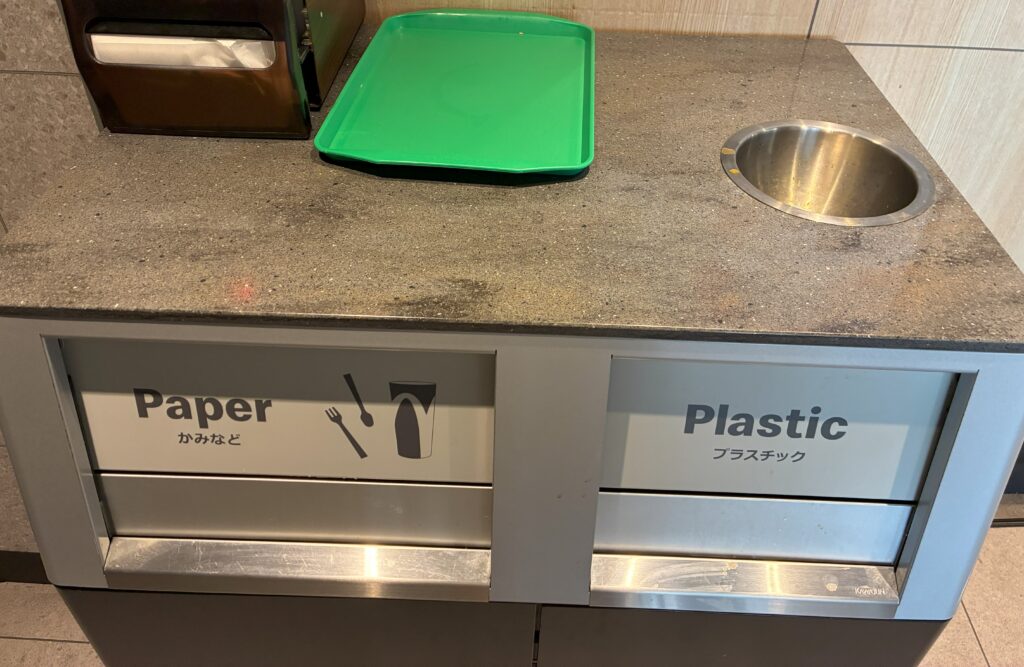 右利きの人が、飲み物の蓋を右手で取り、飲み残しを排水口に捨て、紙の本体部分とプラスチックの蓋の部分をそれぞれ紙とプラスチックのごみ捨て口に捨てるのにとても適しています。
