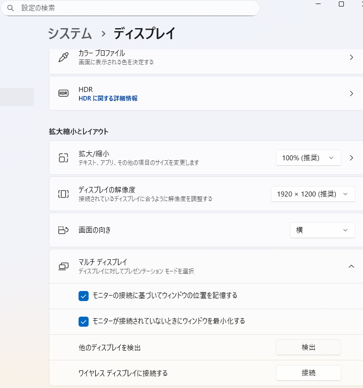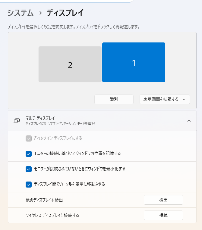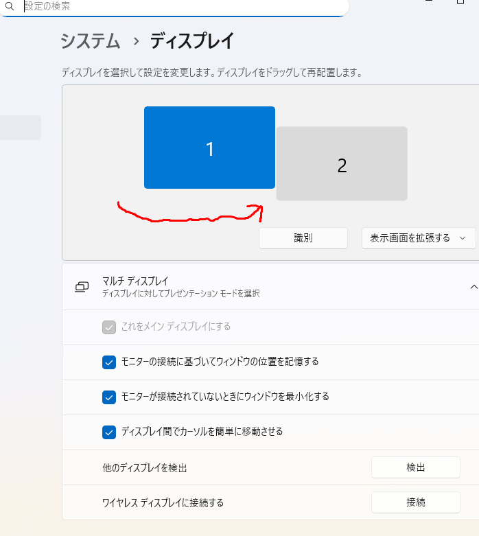 そこで、「マルチディスプレイ」の「他のディスプレイを検出」部分の「検出」ボタンをクリックします。