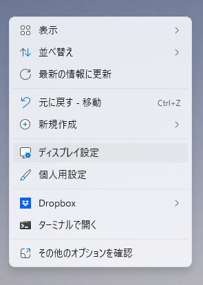 後からモニターの位置関係を変更する場合は、同じくデスクトップ画面で右クリックし、ディスプレイを選択します。
