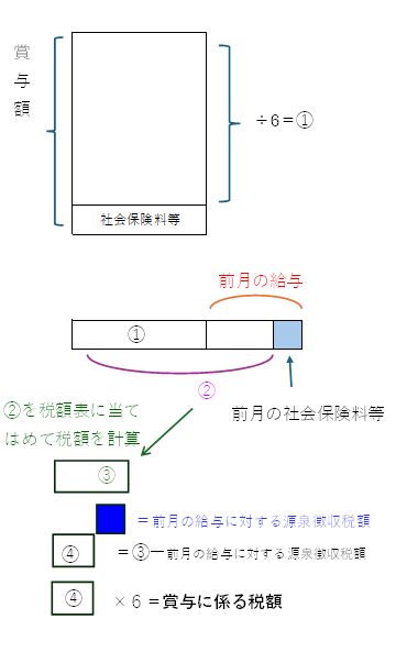 ただし、賞与の計算期間が6ヶ月を超える場合には、賞与から社会保険料を差し引いた金額を1/12にして同じ方法で計算します。