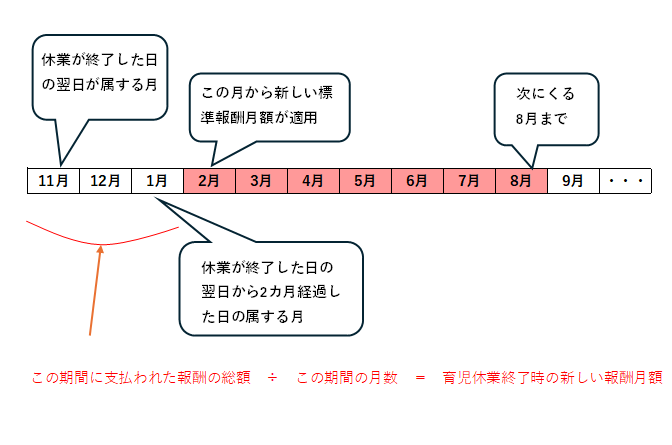 例えば、11月1日に育児休業を終了して職場に復帰したとすると、下図のようになります。