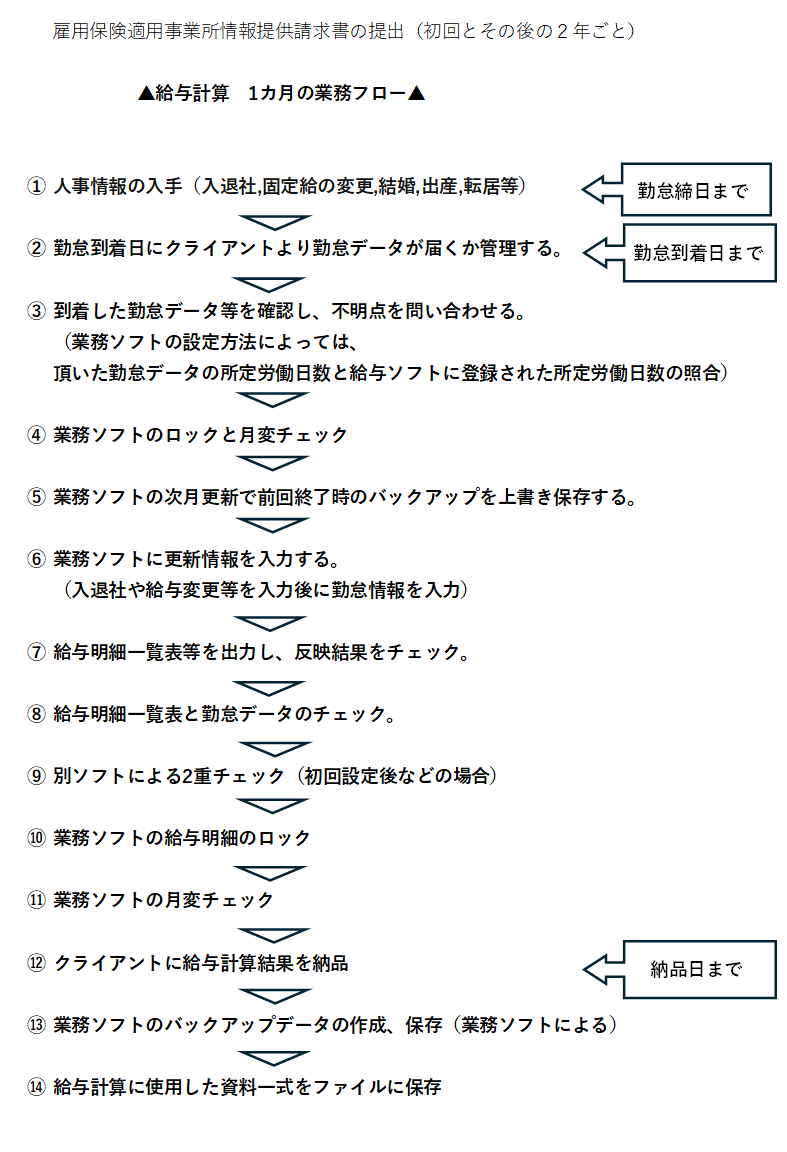 この表の1番上に「適用事業所情報提供請求書の提出」とあるのは、給与計算業務とは直接関係ありませんが、新規に給与計算の業務を受任いただいた場合に提出したいもので、備忘録として記載しています。