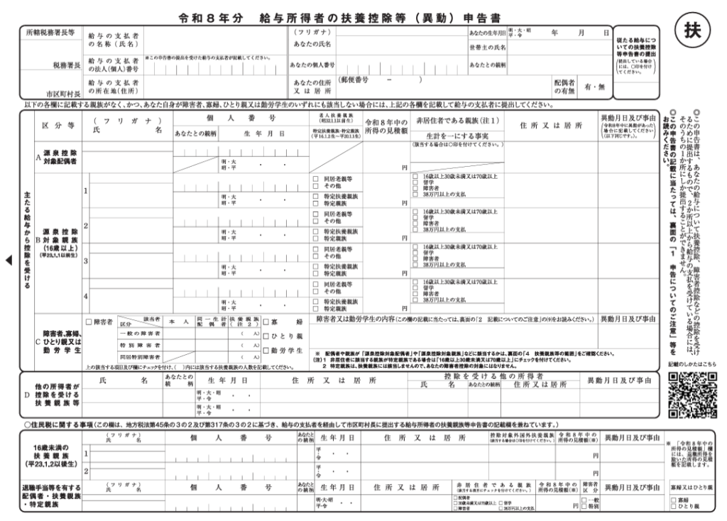 年の途中で、次のような事情が生じた場合には、扶養控除等(異動)申告書の異動申告が必要となります。