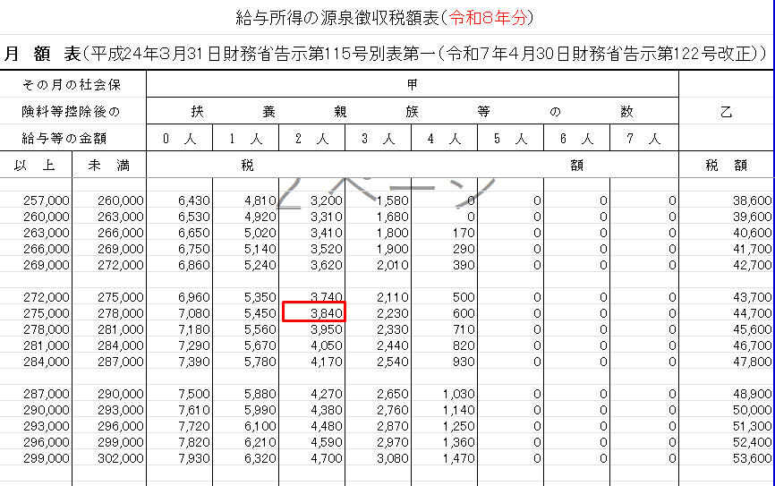 例えば、扶養親族等の数2人、その月の課税対象となる給与の額が325,000円、控除される社会保険料等の額が49,228円だとすれば、325,000円-49,228円=275,772円を甲欄2人に当てはめて、源泉徴収税額は3,840円となります。