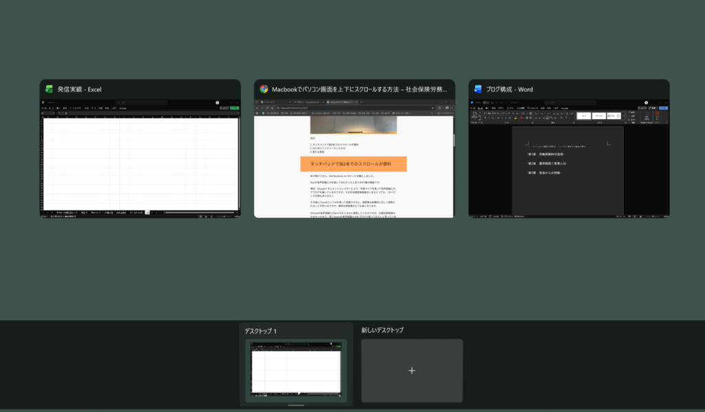 3本指でタッチパッド上を上に擦ると、次のような画面が現れます。