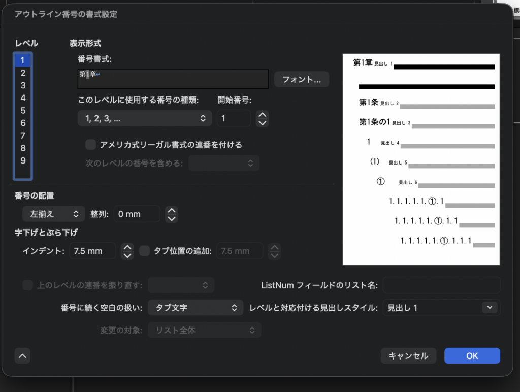 上画像のように「新しいアウトラインの定義」から設定できます。