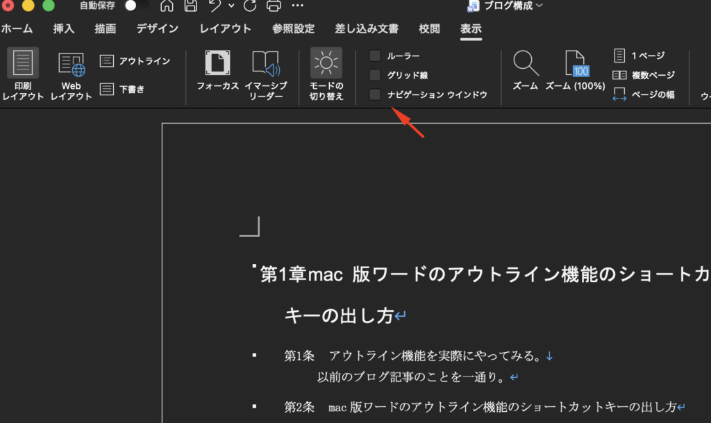Mac版ワードのアウトライン機能は、だいたいエクセル版と同じように使えます。