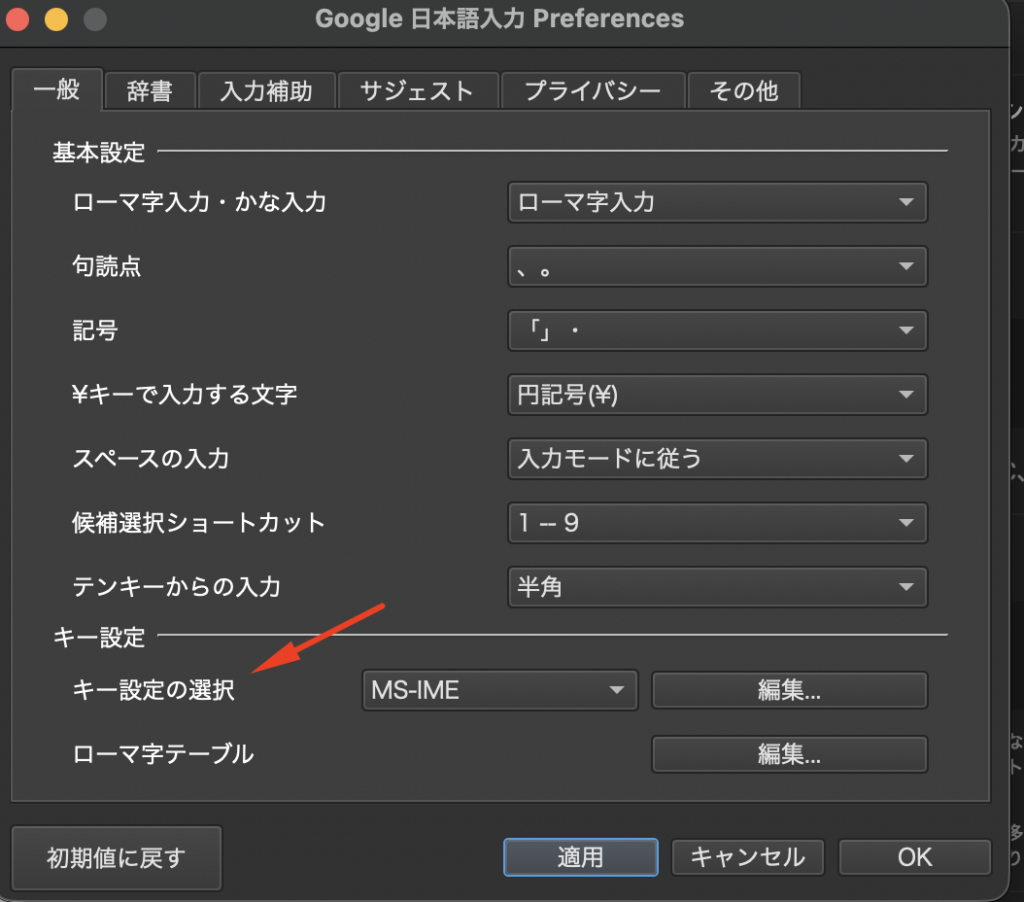 デフォルトでは、「キー設定の選択」はことえりになっています。