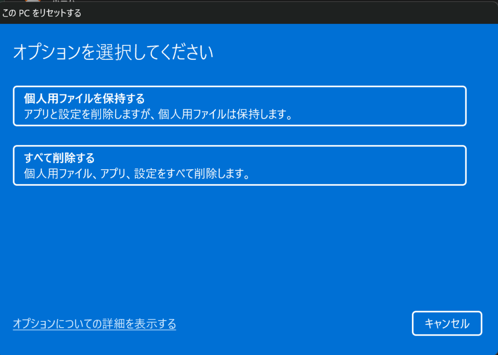 すると、「個人用ファイルを保持する」と「すべて削除する」の2つが選択できます。
