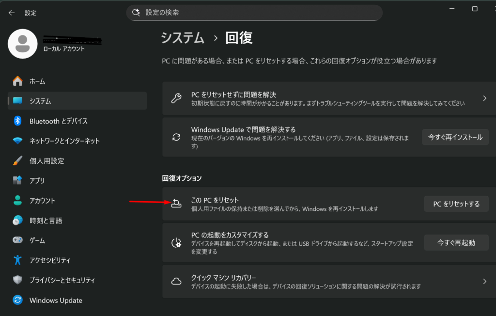 Windowsキーから「設定」→「システム」→「回復」と進むと、「このPCをリセット」という項目があります。
