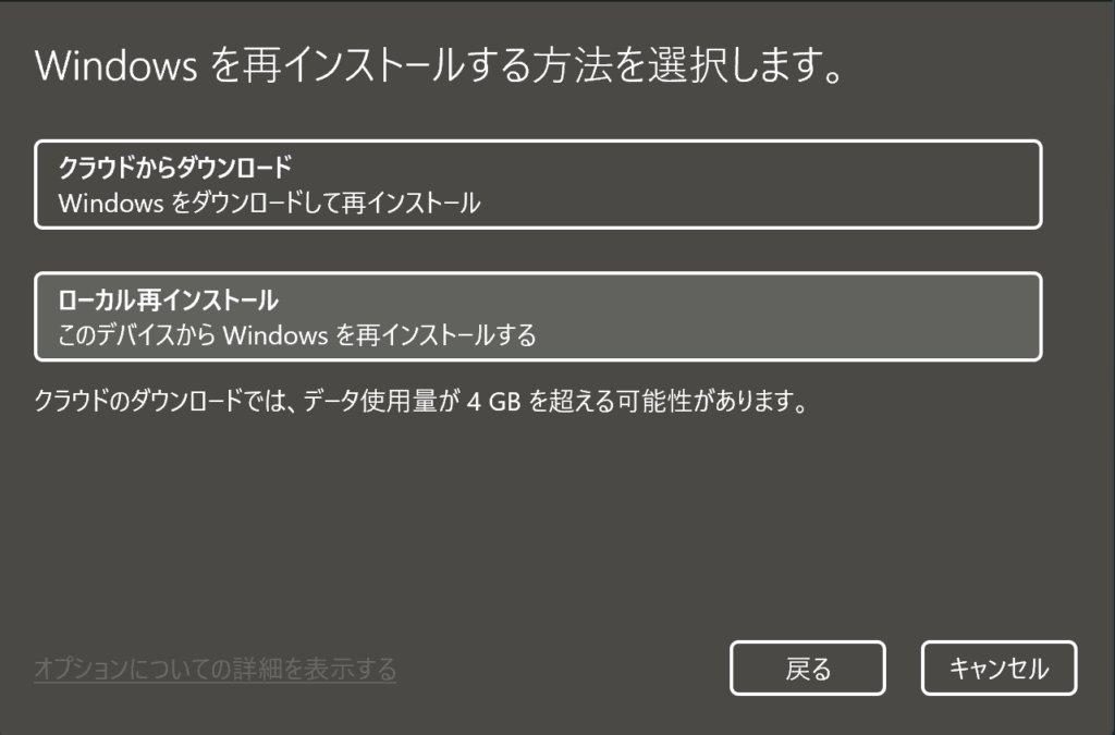 上の図は、「ローカル再インストール」を選択しました。