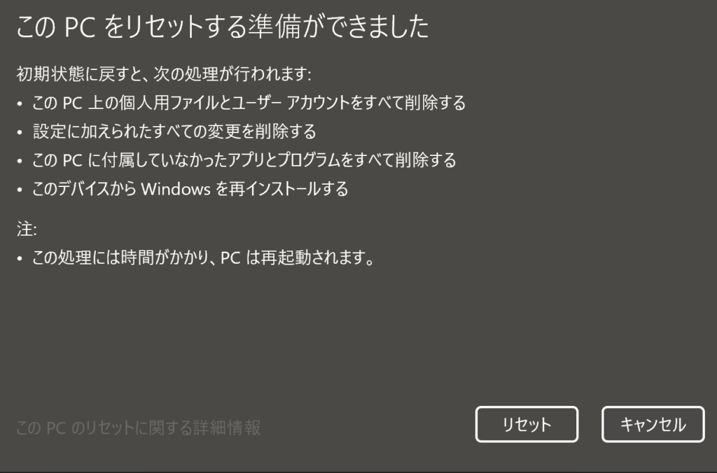 最後に確認画面が出てきますので、確認して「リセット」をクリックします。