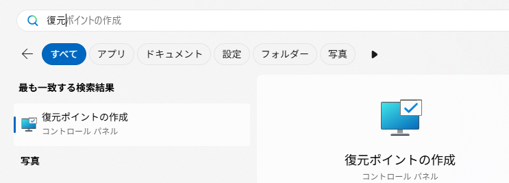 Windowsキーをクリックして、「復元」と入力すると、「復元ポイントの作成」という項目が出てきます。
