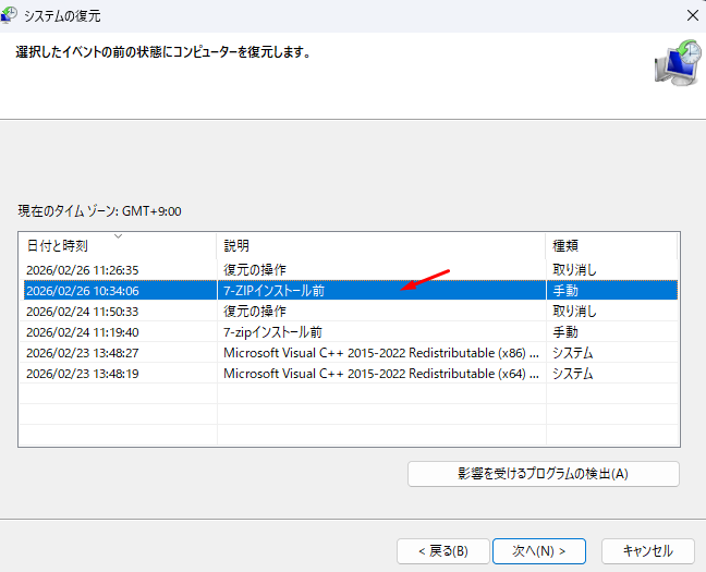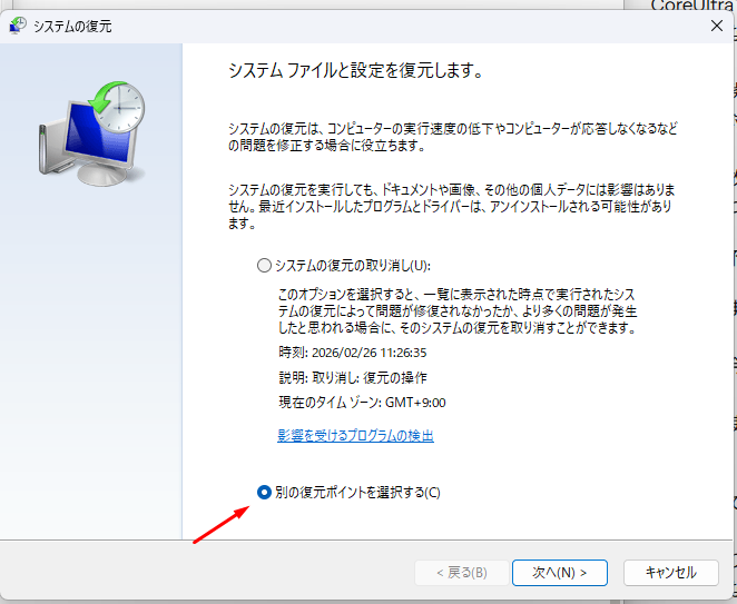 別の復元ポイントを選択します。