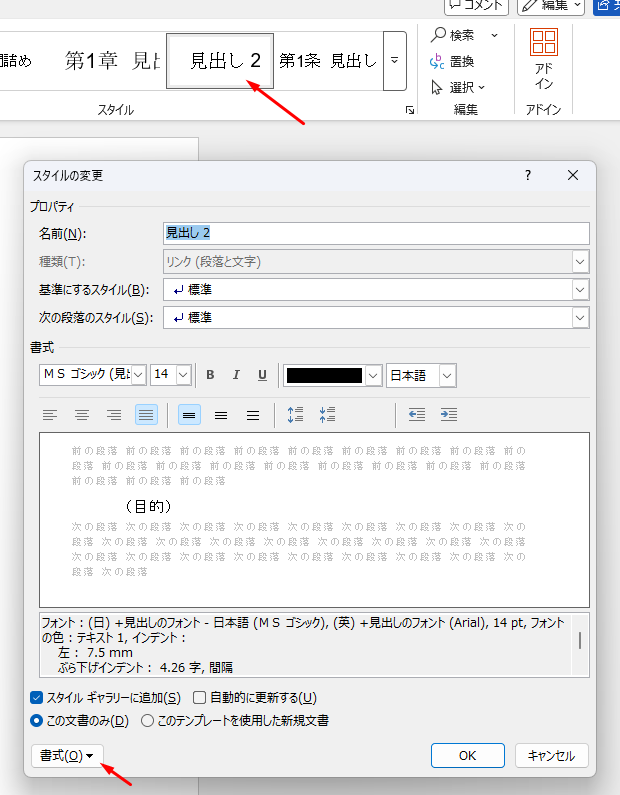 見出しを左側に寄せたい場合は、Wordの左上の「見出し2」を右クリックして、変更をクリックします。