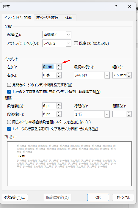 2行目以降の文章の始まりを左側に持っていきたいときは、上の図のインデントの幅が「7.5mm」となっているところを「0mm」とします。