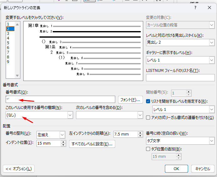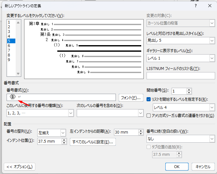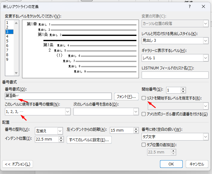 「条」のレベルでは、右側の「リストを開始するレベルを指定する」のチェックを外します。