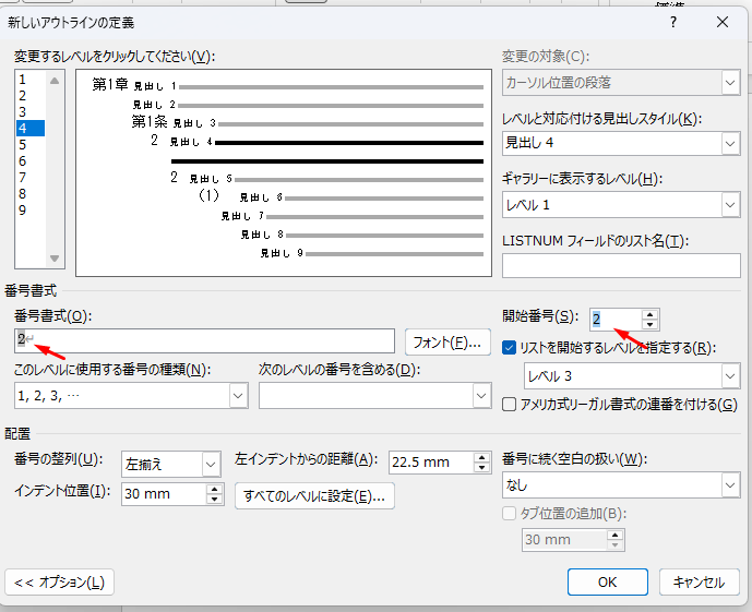 「項」のレベルですが、開始番号を2に変更します。