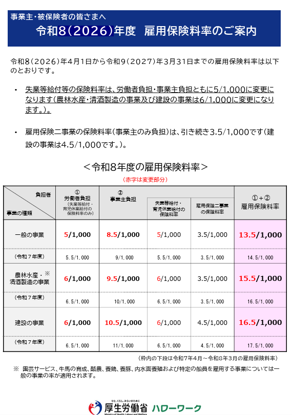 令和8年度の雇用保険料率のご案内が公表されました。